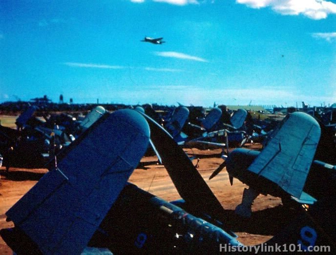 Rows of SB2C's with wings folded await their call to battle at a Pacific base. March 1945