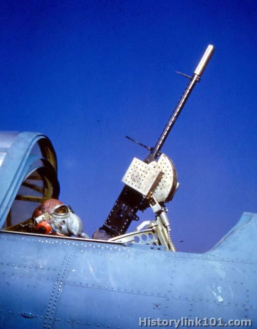 Aerial gunner mans 30 cal. machine gun in rear seat of SBD.
