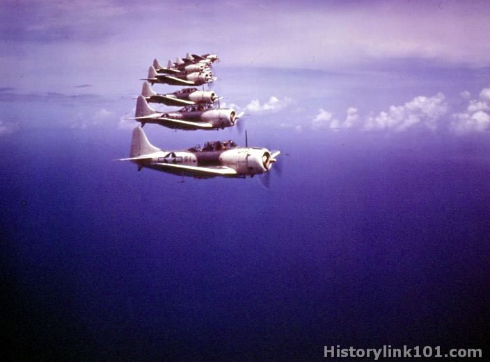 SBD's fly in formation over Caribbean, protecting shipping lanes.