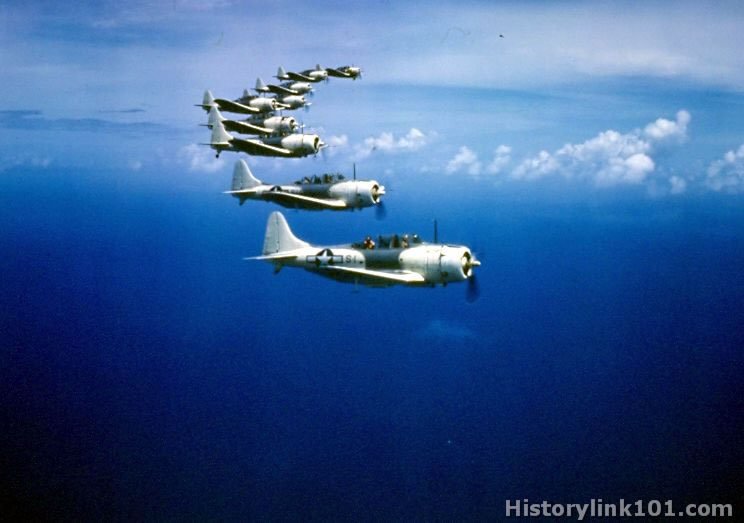 SBD's fly in formation over Caribbean, protecting shipping lanes.