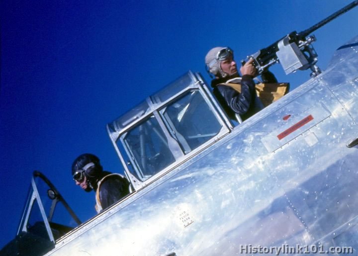 Aircrewman practices gunnery with .50 cal in rear seat of SBD.