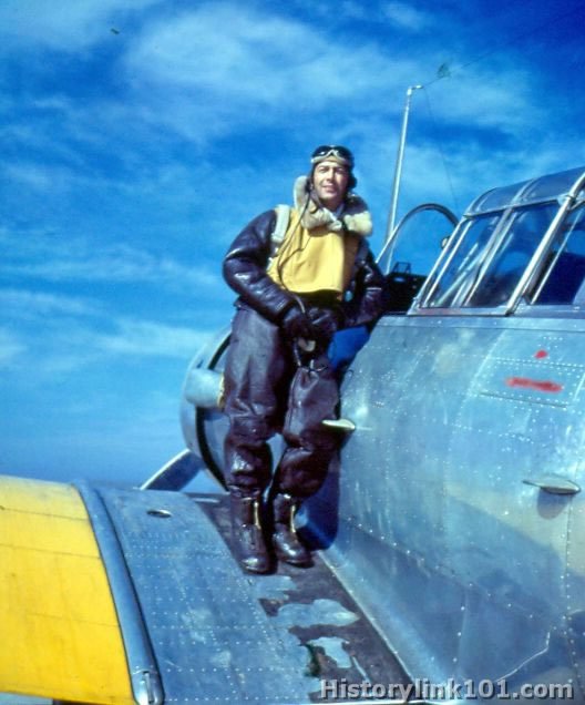 Ltjg. Robert Taylor, USNR, is shown by SNJ at West Coast Air Station where he is an instructor.