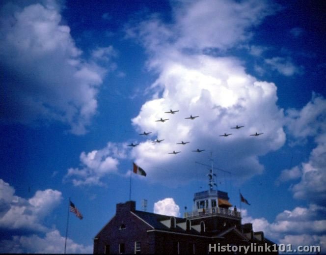 Flight of Navy Scout Trainers (SNJ) Over Conrad Tower at NAS Pensacola.