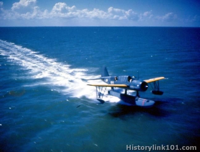 Invasion of Makin Atoll, Gilbert Island as seen from USS Minneapolis. An SOC scout observation plane comes in to be taken aboard cruiser for refueling.
