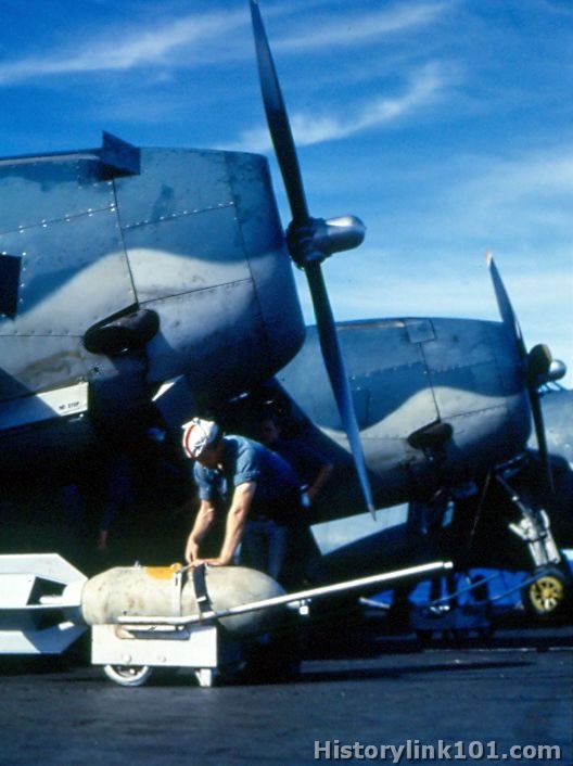 Ordnancemen load depth bombs on TBF's on US Carrier. 1942