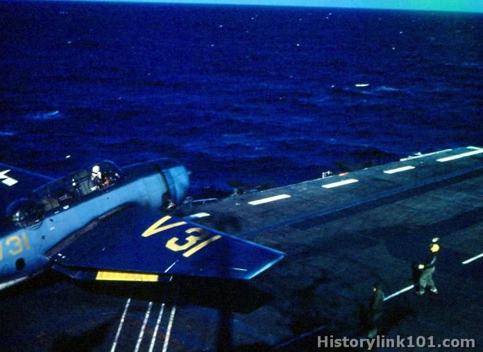 TBM being prepared to be catapulted from deck of USS Matanian. March 1945
