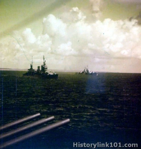 Saipan Is., in Marianas being shelled by ComCruDiv-6. June 1944. US Cruisers off Saipan-participating in the shelling of enemy installations in support of landing operations.