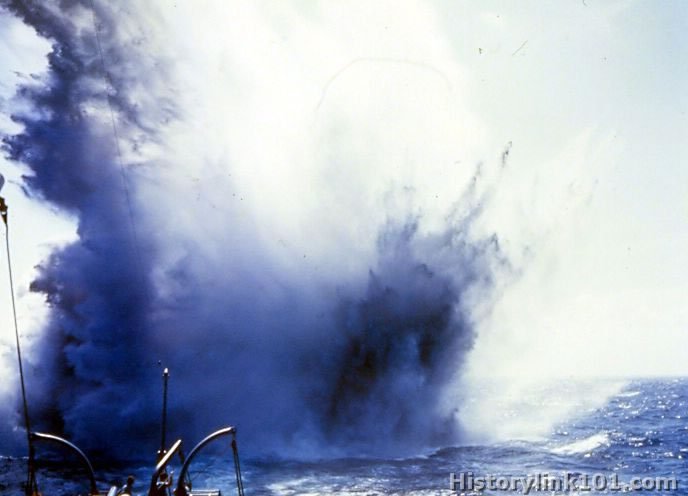 Depth charge dropped from PC boat explodes and sends up geyser of water.