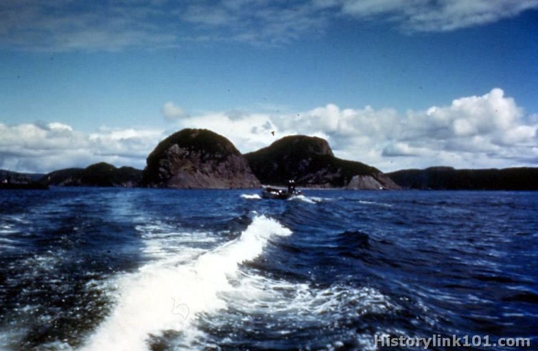 Liberty boats from US warship head for shore with recreation parties at Argentia Bay, NF.