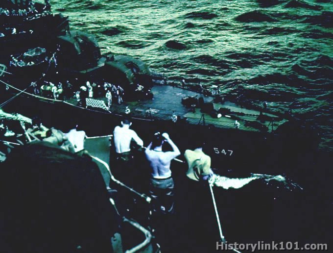 USS Cowell comes alongside the USS Intrepid to return rescued aviators and deliver mail to ship during battle of Philippines. October 24, 1944