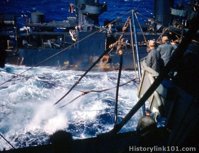 Destroyer coming alongside USS Wisconsin for refueling. Sending fueling hose across. Feb. 27, 1945
