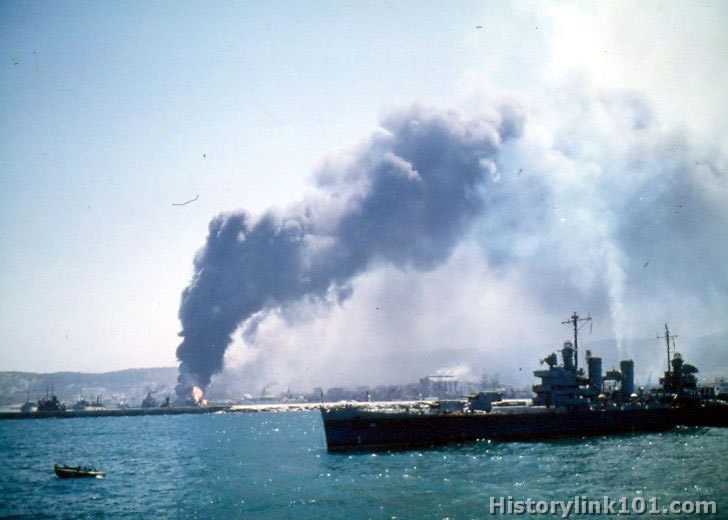 Fire disaster at Algers which destroyed two ships and wrecked several buildings. USS Savannah in foreground. July 16, 1943