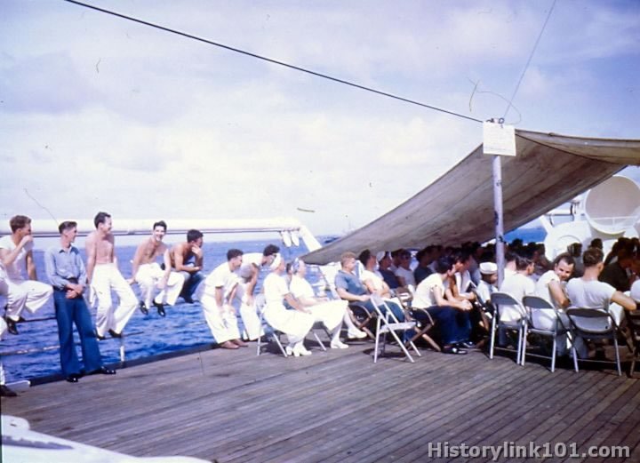 Nurses and patients watching amateur show on top deck of USS Solace. Feb. 8, 1945