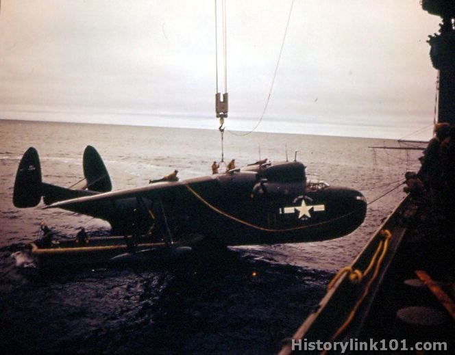 Putting PBM in water over side of USS Pine Island. Dec. 26, 1946