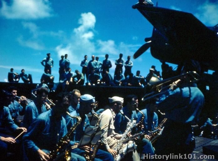Ships orchestra playing for crew at noontime on flight deck of USS Randolph. August 11, 1945