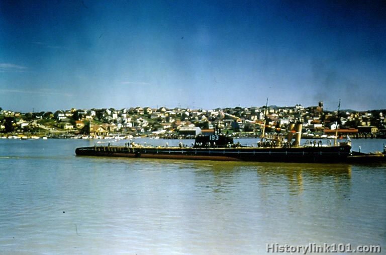 USS Swordfish is launched at Mare Island CA. In water after launching.