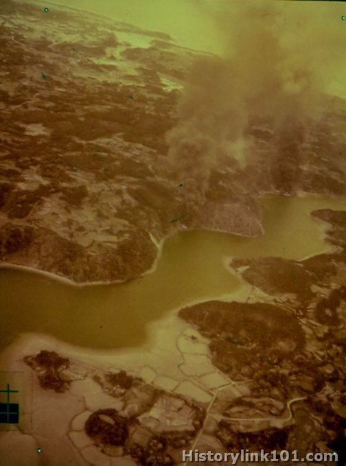 Direct hit on submarine pen at Unten Ko,Ryukyus, by torpedo bomber of VT-83 from the USS Essex. March 28, 1945