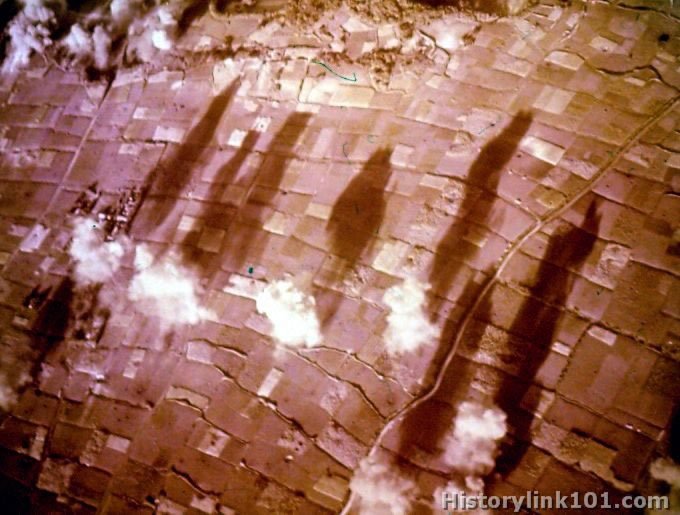 Bursting bombs from VT-83 disrupting Jap Communication behind invasion beach on Okinawa, Ryukyu. April 1, 1945