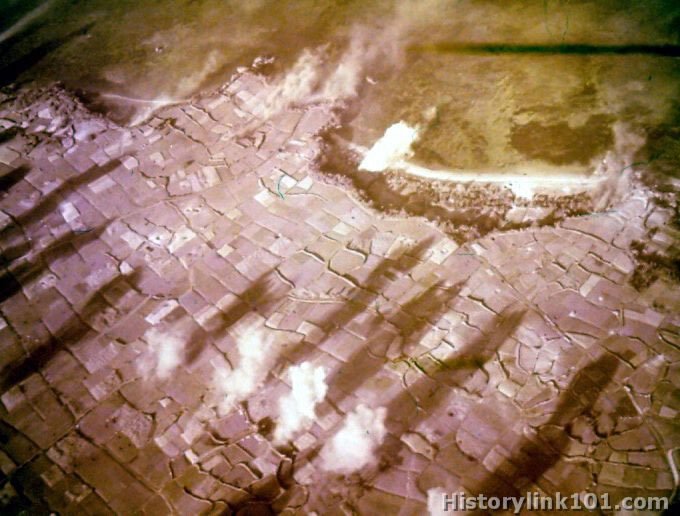 Bursting bombs from VT-83 disrupting Jap Communication behind invasion beach on Okinawa, Ryukyu. April 1, 1945