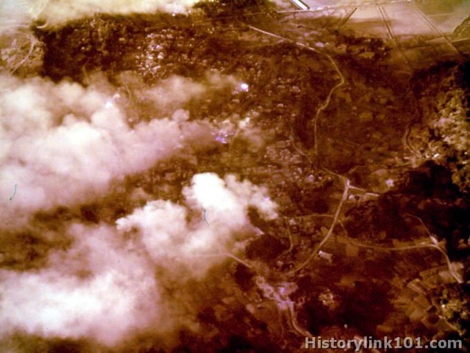 Fires started by plane from VT-83 in Miyagueuku on Okinawa, Ryukyus. April 1, 1945