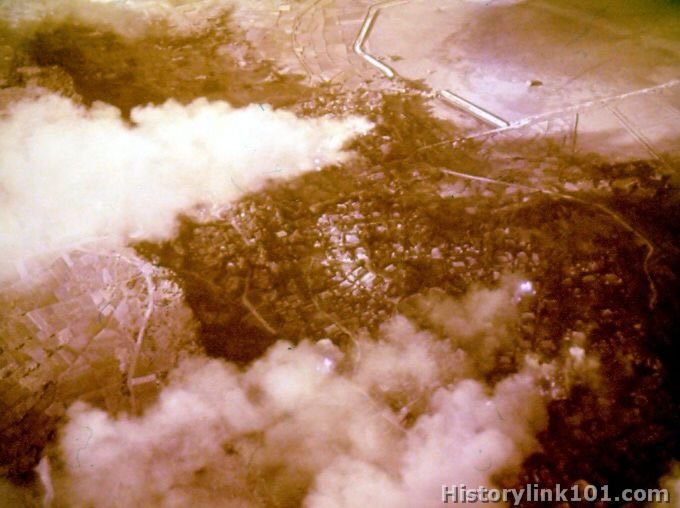 Fires started by plane from VT-83 in Miyagueuku on Okinawa, Ryukyus. April 1, 1945