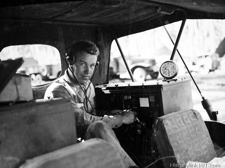 In the field on Guadalcanal with a combat telephone and radio communications Marine Corps force, is shown here in a radio jeep. This private handles vital military code, receives and sends out alarms on air raids or other enemy movements.