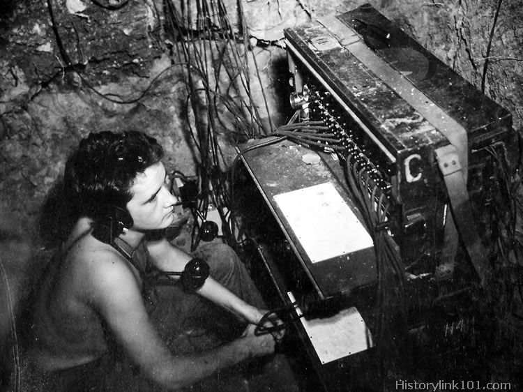 A bomb-proof shelter shields this telephone switchboard and the Marine Operator from the constant bombing of US positions on Guadalcanal. The switchboard, with connection lines running out to all field forces is portable and can be moved on a few minutes notice. Guadalcanal - 1942
