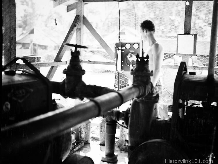 GUADALCANAL WATER WORKS' PUMPS.These two four inch pumps lift daily 370,000 gallons of water from a 237 foot deep well, supplying water for over 30,000 men. The Water Works were built on the fringe of the jungle, where barely a year ago Marines were still battling the Japs.