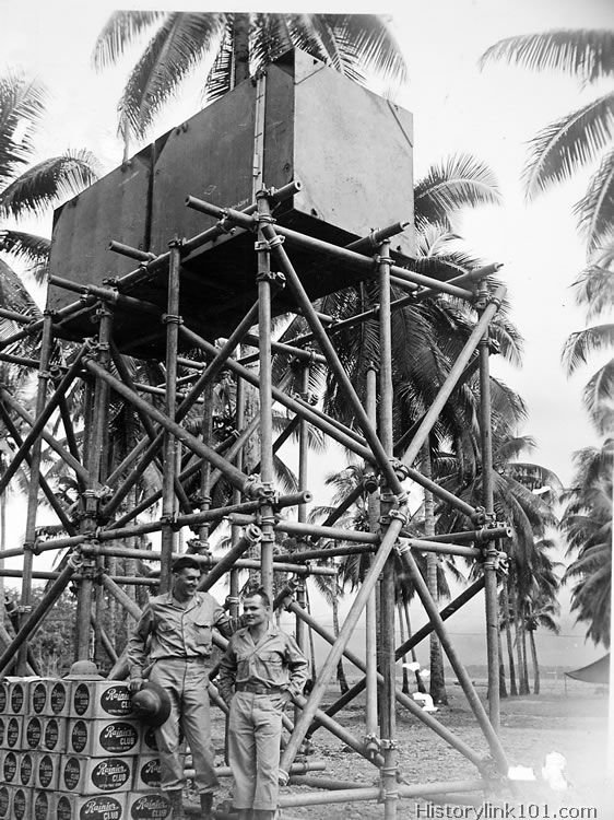 Civilization is becoming increasingly evident on this historical battleground. People in the USA would hardly expect to see a water storage tank, such as pictured here, on Gaudalcanal. Further evidence is the stack of beer. January 24, 1944 - Guadalcanal