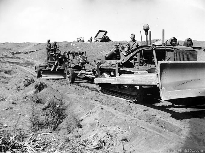 Shots of a pull grader and "cat" working on the road at the east side of Motoyama Airfield #2. The road has just been cleared of mines. Iwo Jima - March 8, 1945