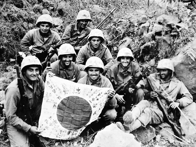 Group of Marines posing with Jap flag. Iwo Jima - 1945