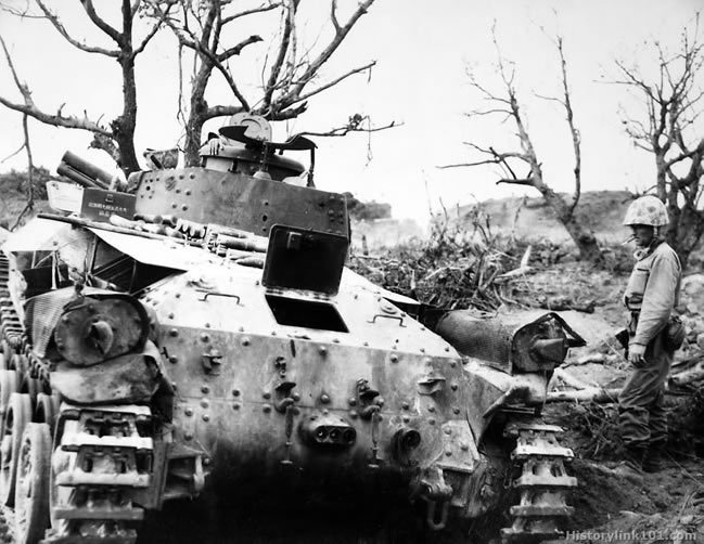 Rear view of model 97 Jap medium tank. Note twin exhausts and 57 mm ammo piled in front of turret. Iwo Jima - 1945