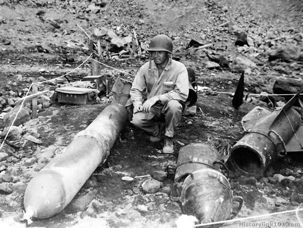 Frontal view of 300mm. Rocket length 9' 5" Wt. 750 pounds and disassembled 320 mm. Spigot mortar showing 3 sections of mortar and base plate. Iwo Jima March 11, 1945