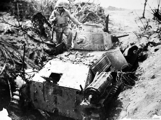 Rear view of revetted Model 96 Jap light tank. Iwo Jima - 1945