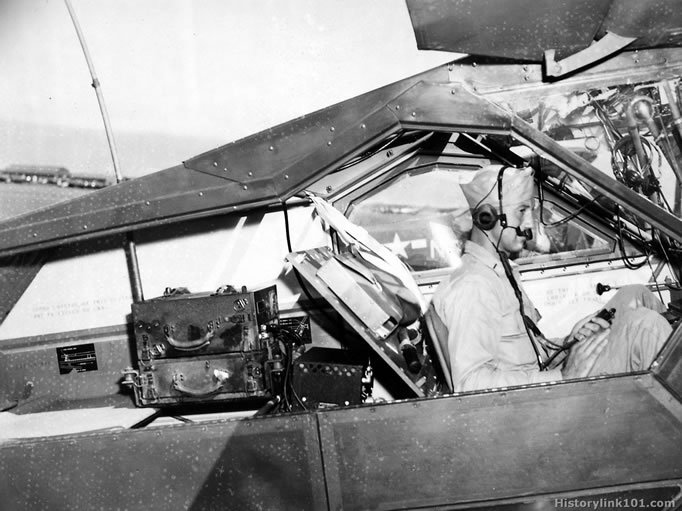 Radio and operator in plane. Operator using lip mike. Iwo Jima - 1945