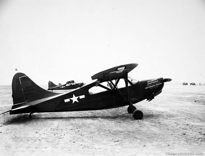 Simson air spotter plane, used for spotting targets for our artillery lived up on Airfield #1. The plane nearest was sponsored by students of Eastbrook School District, as can be seen by letter on front. Iwo Jima - Feb. 1945