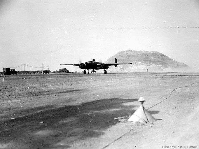 TARGET-TOKYO HARBOR- With famed Suribachi as a backdrop, a Mitchell medium-bomber of the 4th Marine Air Wing prepares for take-off on a night anti-shipping search to waters off Tokyo and key mainland industrial cities. From strategic Iwo's newly reconstructed Motoyama Field, oncr powerful Jap air base, rocket-firing Mitchells operate nightly agiainst desperate coastal ships atttempting to reach by-passed garrisons in the nearby Bonins.