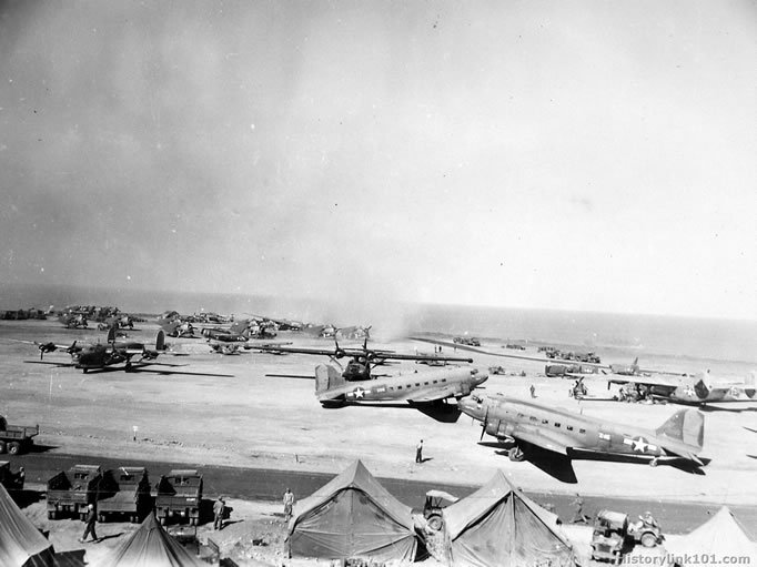 MOTOYAMA SCENE ON IWO JIMA - As Marine transports in the foreground take on their loads of Leathernecks wounded in the fierce fighting only a mile away, across the shell-scarred strip Fourth Marine Air Wing torpedo bombers lumber down the taxiway to start their night and day patrol missions defending sea approaches to this strategic island outpost, only 700 miles from Japan. Iwo Jima, March 10-14, 1945.