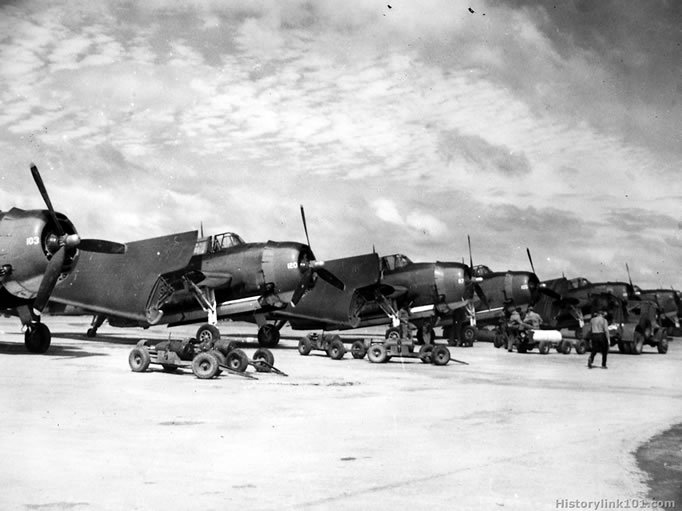 CONTROLLING THE AIR AND SEA - Marine avenger torpedo bombers receive their loads of depth bombs on Motoyama Airfield No. 2, Iwo Jima. From the new Marine won base, the Avengers maintain a 24 hour schedule of patrols, keeping the skies and sea free of enemy raiders. Iwo Jima - March 45