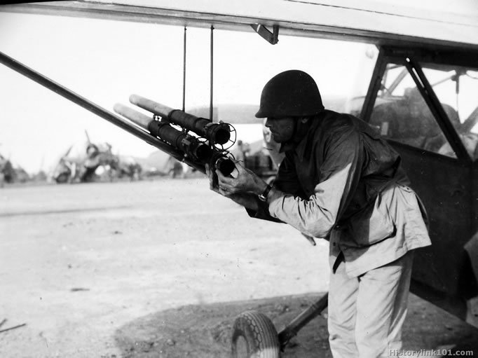 Loading bazooka on OY-1. Iwo Jima - March 1945