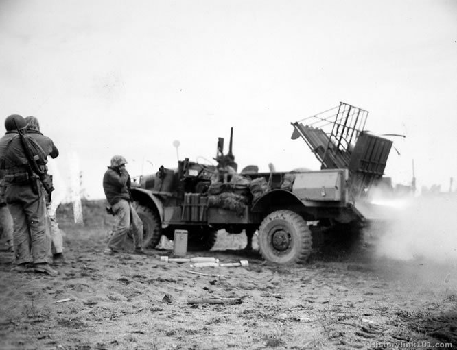 Marine rockets firing at the Japanese. Hit and run tactics were used so the Japanese couldn't line up sights to knock out the rocket trucks. Iwo Jima - Februrary 1945