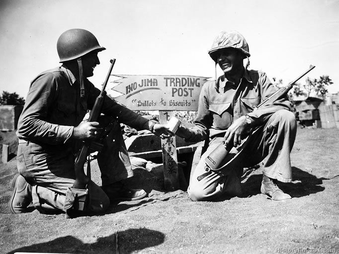 "Iwo Jima Trading Post: Bullets to Biscuits," the sign reads and 25th Division Marines arrange a "Business deal" over one can of beans. These men helped win the battle of supply which had much to do with the taking of Iwo Jima. Iwo Jima