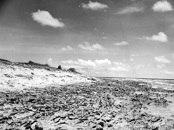 The sea side of the atoll is subjected to constant winds. The beach is jagged coral rips boat bottoms asunder, leaving feastering hard to cure sores in men. Samoan Area - October 1942