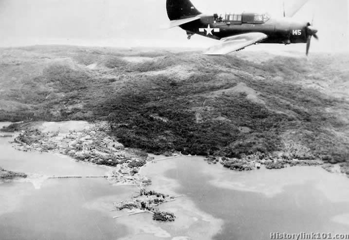 Picture of SB2C over Yaptown on August 28, 1945 after message appeared on airstrip. Yap Island