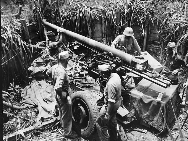 Jap 75 mm AA gun in hills back of Yap Town. Yap Island - Sept. 16, 1945