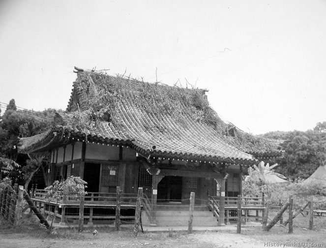 The effects of the battle of Okinawa on the Buddhist temple near the Marines' airfield are visible on this shot. The temple stands in a clearing in a mountain woodland. Its heavy tile roof is of Japanese design. The walls and beams are of cedar the aroma of which permeates the air inside the temple. Okinawa 1945