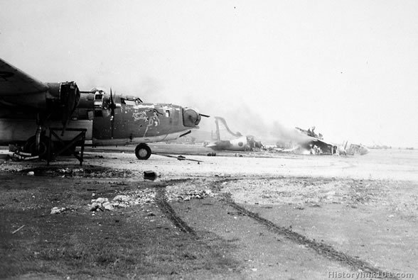 C-54 set afire by Japs with nose of B-24 in the foreground. Okinawa - May 1945
