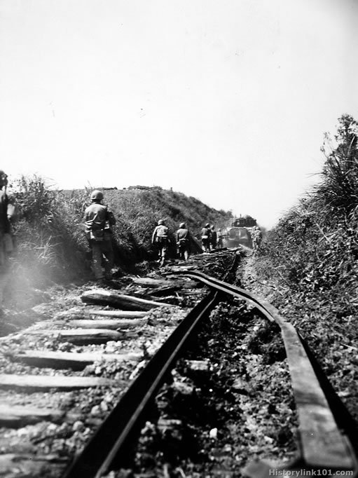 Men of the 1st Battalion, 29th Marines advancing along the railroad tracks on Shuri behind out tanks. Some men carry flame throwers. Okinawa - May 1945