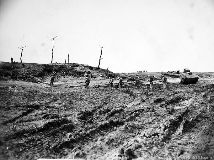 Marines of "C" Co, 1st BN, 7th Reg. Advancing to front line action. Okinawa - May 11, 1945